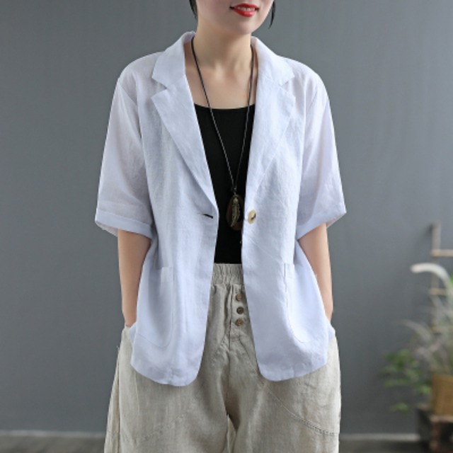 キレイめな印象の半袖のノーカラージャケットです。 上品なコーディネートにも、カジュアルなコーディネートにもマッチする素敵な一着となっています。 商品番号 ci12307 色展開 ホワイト グリーン サイズ S M L XL 2XL サイズ(cm) S /着丈 48 /肩幅 36 /袖丈 22 /バスト 88 M /着丈 49 /肩幅 37 /袖丈 22.5 /バスト 92 L /着丈 50 /肩幅 38 /袖丈 23 /バスト 96 XL /着丈 51 /肩幅 39 /袖丈 23.5 /バスト 100 2XL /着丈 52 /肩幅 40 /袖丈 24 /バスト 104 《商品について》 ※当ショップは海外からのノーブランド商品になります。 海外製品のため日本商品に比べ品質が劣る場合がございます。 糸のほつれ、多少の汚れやシミ、ファスナーが固い、デザインの若干の違いなどは不良品には該当しませんのでご了承ください。 お手持ちの携帯やPCの画面設定の影響により、実物と色味が異なって見える場合がございます。 ※当ショップはお客様より注文を確認した上でメーカーに発注しておりますので返品、交換は出来かねます。ご了承下さいませ。 《発送について》 お取り寄せ商品のため、ご入金確認後、お届けまでに「10-24日程度」のお時間がかかります。 通常よりもお時間がかかってしまう場合もございます。 欠品や商品の不具合などにより、商品をお届けすることができず、ご注文をキャンセルさせていただく場合もございますのでご了承ください。 ※当ショップの商品はお取り寄せ商品につき、入金確認後メーカーへ発注させて頂きます。 ※メーカーにて在庫切れの場合は、速やかに返金させて頂きます。 《返品についての特約に関する事項》 ご注文確定後、発注後のキャンセルやサイズなどの内容変更は承っておりません。 注文時によくご確認ください 商品に欠陥がある場合を除き、基本的には返品や交換には応じません。 最後までご覧くださり、ありがとうございました。