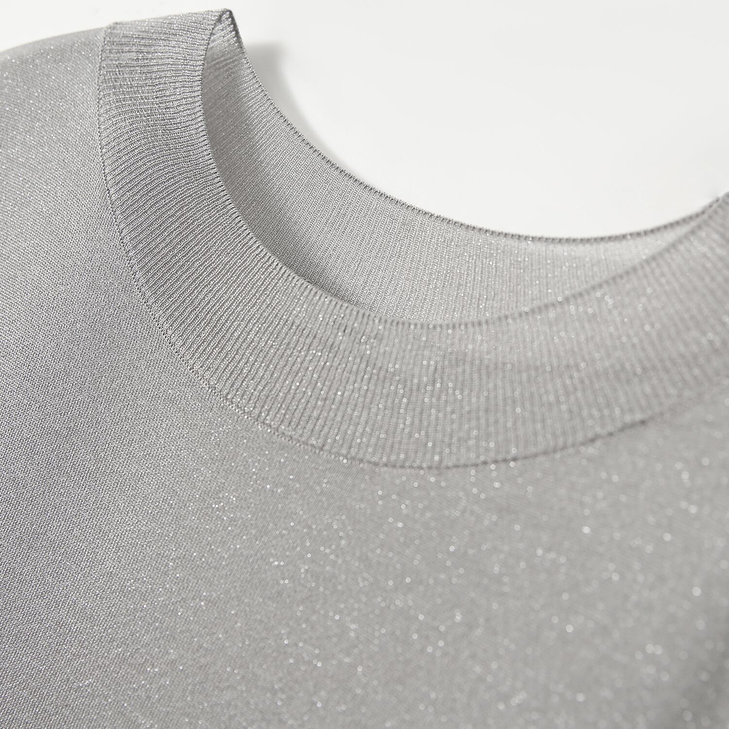 やや薄手で、光沢のある生地感が上質で、エレガントなシルエットが素敵なのーすりニットです。